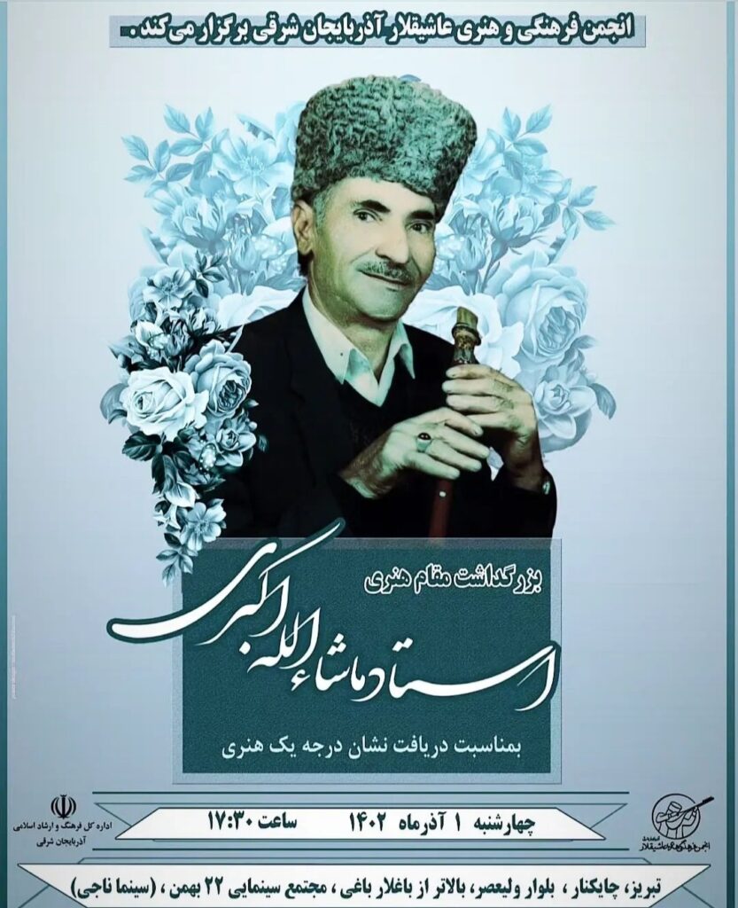 به گزارش صاحب دیوان، این مراسم به همت انجمن فرهنگی و هنری آشیقلار آذربایجانشرقی چهارشنبه 1 آذر 1402 ساعت 17:30 برگزار می شود. مراسم بزرگداشت مقام هنری استاد ماشالله اکبری در سینما ناجی تبریز به آدرس بلوار ولیعصر، بالاتر از باغلارباغی، مجتمع سینمایی 22 بهمن میزبان علاقمندان خواهد بود.