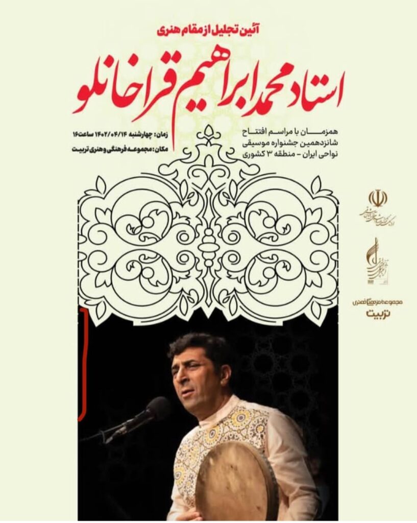 به گزارش صاحب دیوان، این آیین با حضور فعالان و هنرمندان عرصه موسیقی روز چهارشنبه 14 تیرماه 1402 ساعت 16 در مجموعه فرهنگی هنری تربیت برگزار میشود. براساس این گزارش محمدابراهیم قراخانلو متولد 1343 کلیبر و کارشناس ارشد مدیریت اقتصاد است. وی فعالیت هنری خود را از سال 1365 آغاز کرده و خواننده سولیست در ارکسترهای استاد شاطریان […]